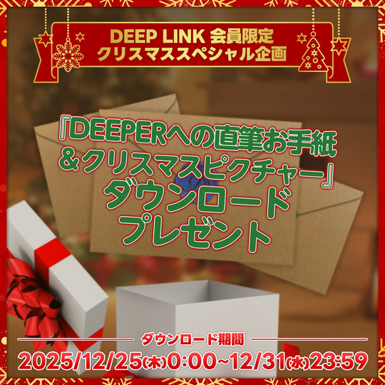 DEEP LINK会員の皆さん、メリークリスマス! DEEP LINK クリスマス限定ページがオープンしました! 限定ページでは、『クリスマスピクチャー』『DEEPERへのお手紙』をダウンロードプレゼント! さらに、クリスマスムービーも公開☆ 一緒に素敵なクリスマスを過ごしましょう♪ ぜひお楽しみください! 【ダウンロード期間】 2025/12/25(木)0:00〜12/31(水)23:59 >>クリスマス限定ページはこちら >>クリスマスムービーはこちら
