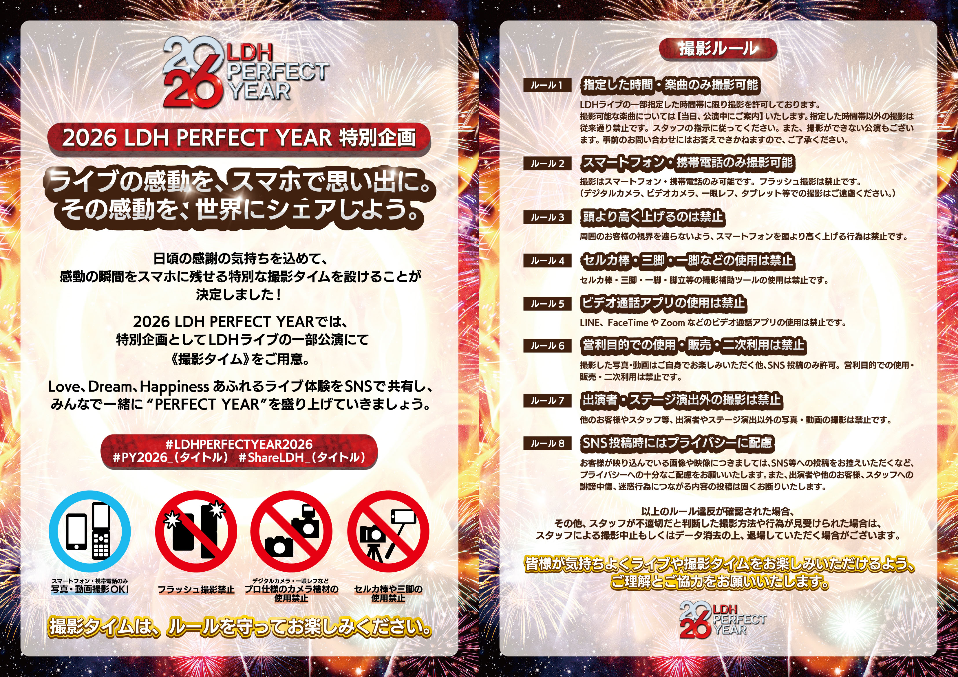 2026 LDH PERFECT YEARでは、特別企画としてLDHライブの一部公演にて《撮影タイム》をご用意。